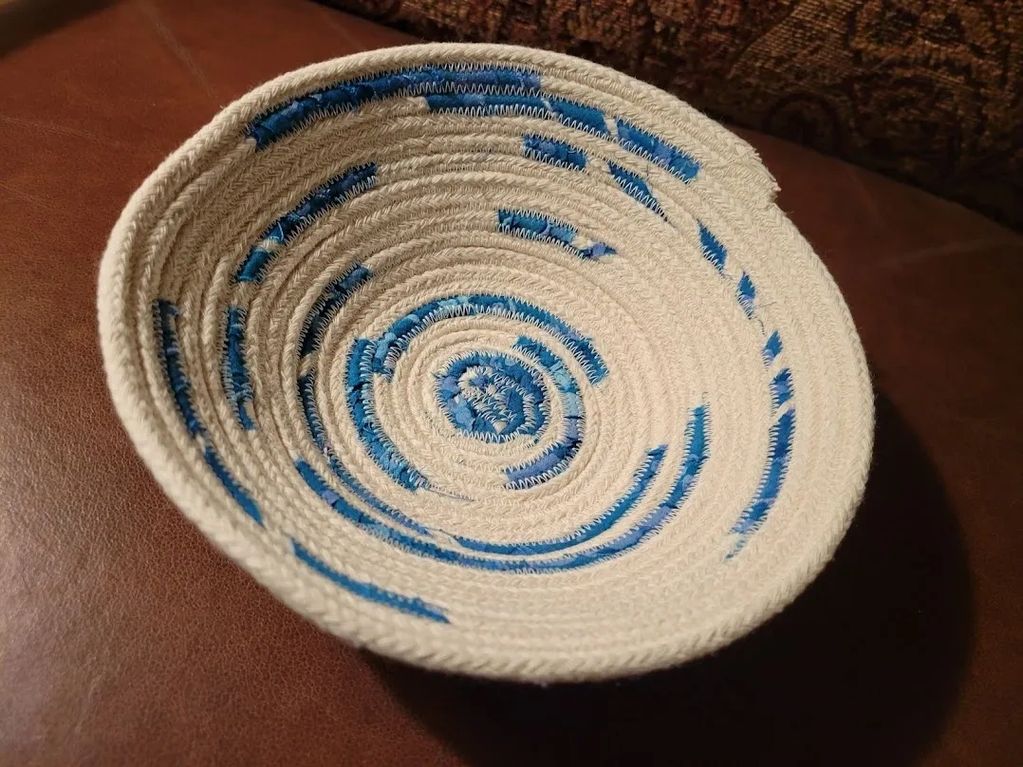 This is a little bowl. It's made of cotton clothesline, wrapped with fabric at certain places for accent. I used cotton thread.
